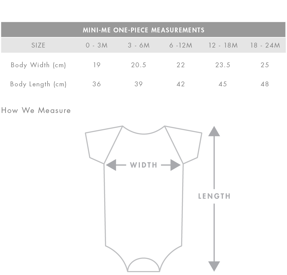 Please check the size chart to avoid disappointment. Lay your own tee/onesie flat on a table, measure armpit to armpit across the chest and match to the size you feel is best. Please note measurements can vary within 2.5cm, this is within the accepted tolerance.