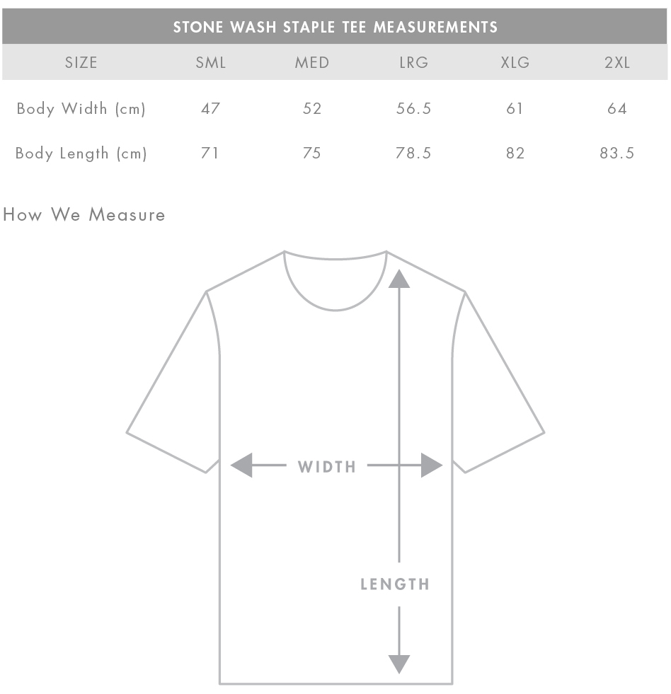 FIT: Regular fit - please check the size chart to avoid disappointment. Lay your own tee flat on a table, measure armpit to armpit across the chest and match to the size you feel is best. Please note measurements can vary within 2.5cm, this is within the accepted tolerance.